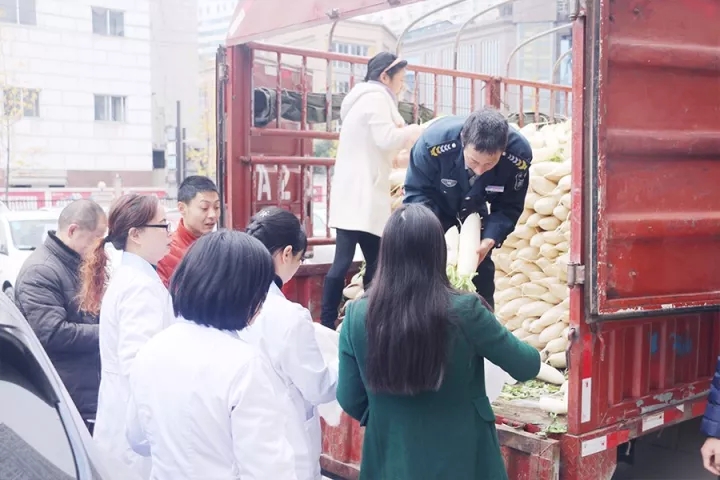 2021年12月1日上午9点半,贵阳正宇铁路医院大门口一辆满载着希望和爱心的大货车格外引人注目。车上是医院一大早从修文县大坪子拖回的6000斤新鲜水灵的白萝卜。南明区兴关路街道辖区的低保户、困难户在街道党委工作人员组织下早早排起了长队,前来免费领取萝卜。